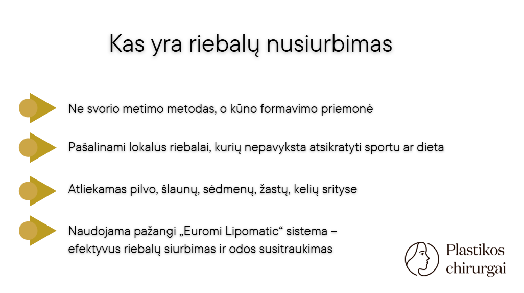 Riebalų nusiurbimas yra ne svorio metimo sprendimas, bet metodas estetiniam kūno formavimui.