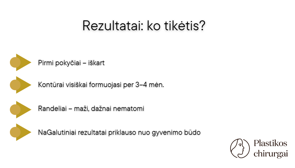 Pooperacinis laikotarpis gali būti susijęs su minimaliu diskomfortu – skausmas ir patinimas, todėl svarbu laikytis pooperacinės priežiūros gairių ir dėvėti kompresinius drabužius, kad būtų užtikrintas greitesnis gijimas ir optimalūs rezultatai.