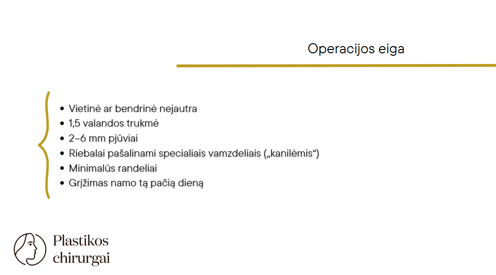 Operacijos metu oda įpjaunama 4-5 mm ar po. Pro angeles, nedidelės skersmens vamzdeliu yra siurbiamos riebalinės ląstelės.